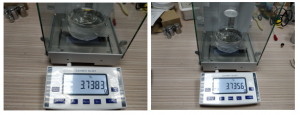 - 重復(fù)剛才的步驟擦拭干剛才測的2號陶瓷材料,確保不沾有一點(diǎn)水。把陶瓷材料放在稱重架上,重復(fù)前面兩個操作步驟。得出以下的測量結(jié)果。