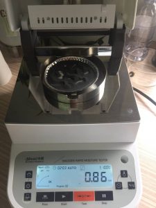 - 測試稀土:為了使測試過程中稀土水分測試儀將稀土烘干烘透,我們將稀土分散開來,以便溫度能滲透進稀土內(nèi)部。取1克多稀土撒于不銹鋼托盤中,用勺子將稀土平鋪均勻至鋪滿整個盤中,為避免稀土高溫烘烤后除水分外的其他物質(zhì)也同樣揮發(fā)掉,我們將溫度設(shè)置在100℃就好,按“START”鍵開始測試,2分03秒后檢測結(jié)束,檢測數(shù)據(jù)顯示0.86%;