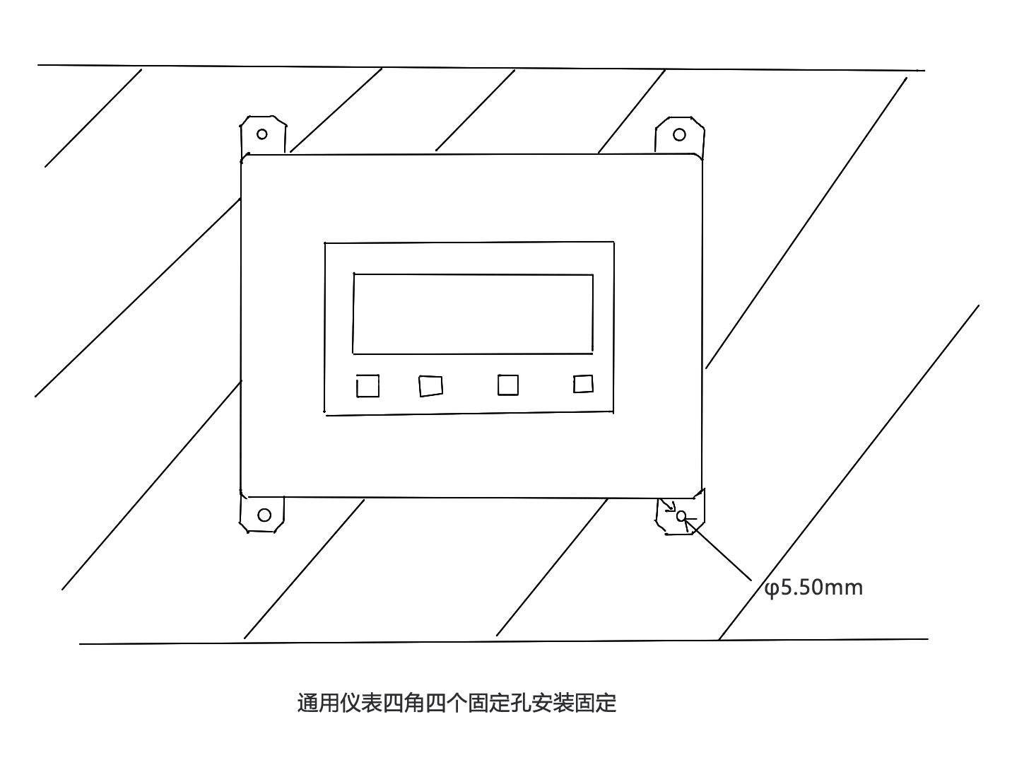 儀表可以通過四角四個固定孔進行安裝固定,安裝在墻面或者生產(chǎn)儀表設(shè)備上,例如可以安裝在生產(chǎn)設(shè)備槽鋼支架上。